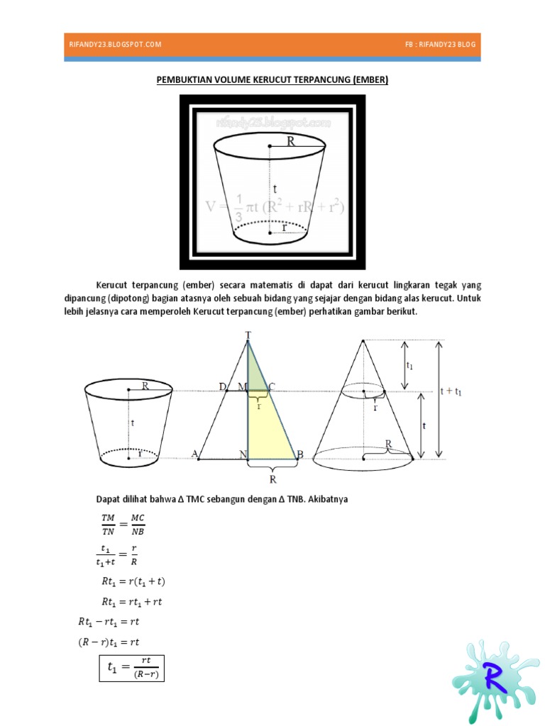 Kerucut mrupakan bangun ruang sisi lengkung yang mempunyai du. Telah diketahui sebelumnya yakni pada saat membuktikan rumus volume kerucut terpancung bahwa. Saya tahu ini cukup mudah, tapi nyatanya di beberapa situs kita mulai soal ini dengan kasus mencari volume dari kerucut terpancung, seperti pada gambar. Jadi, luas seng diperlukan = luas selimut ember + luas alas ember. Rumus untuk menentukan secara langsung volume dan luas permukaan kerucut terpancung. Contoh soal bangun ruang kerucut. Rl menyatakan panjang jari bidang alas kerucut terpancung r 2 menyatakan panjang jari. Kerucut merupakan salah satu bagian dari kelompok bangun ruang sisi lengkung. Luas selimut kerucut terpancung adalah luas kerucut besar dikurangi luas selimut kerucut kecil. Tentukan volume kerucut terpancung jika diameter alasnya 10 dm, diameter sisi atas 4 dm, dan tinggi 4 dm! Pengertian bangun ruang adalah sebuah penamaan atau sebutan. Kerucut terpancung dalam kerucut terpancung berlaku. Kerucut terpancung merupakan sebuah kerucut yang dipotong sejajar bidang alas.